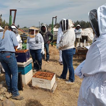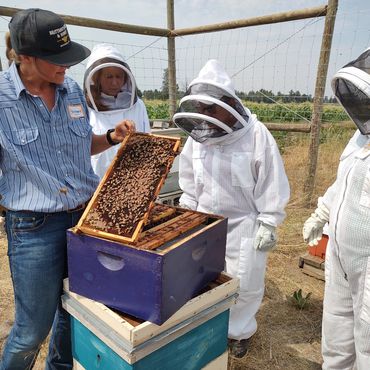 For safety and comfort, wear long sleeves, pants, and close-toed shoes. We’ll provide beekeeping veils, bee suits, or jackets for those who want to participate in the hive inspection.